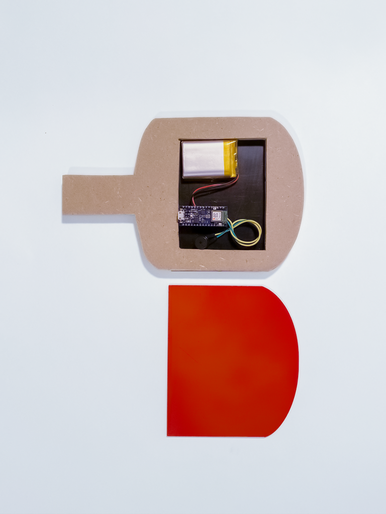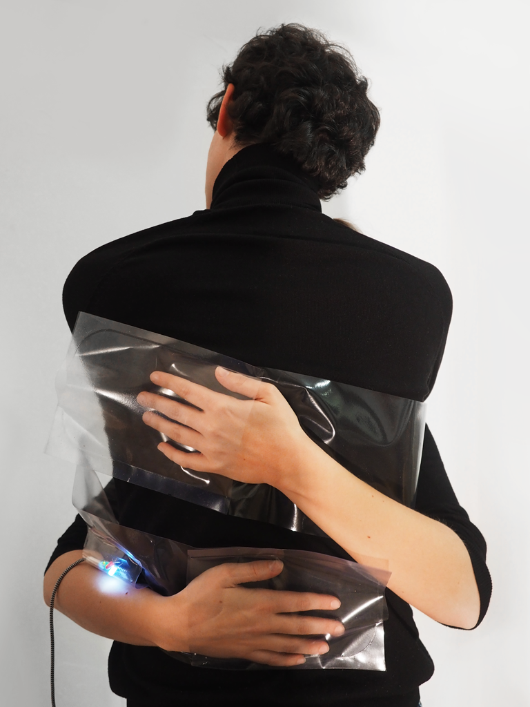 Jasmin and Marie created three different objects that formulate a riddle which has to be solved by two participants. The objects imply three different gestures of affection by their design – hugging, high-fiving, and giving the object to each other. When the participants solve the riddle by performing the gestures, the machine learning model on the Arduino responds with visual confirmation by flashing a colored LED.