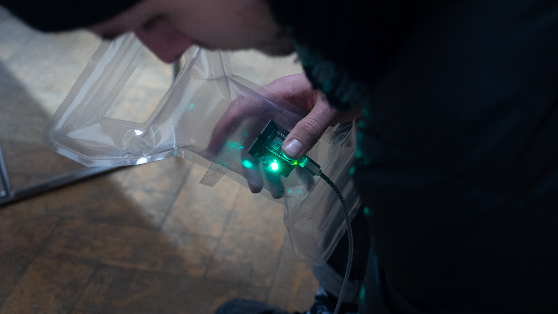Inspired by the magic wand tutorial by Sandeep Mistry and Don Coleman, we spent some time to further expand the functionality of the simple neural network that came with it. A set of movements is collected through the IMU sensors on the Arduino and then used to train a model, which is small enough to be deployed to the Arduino after being trained in a Python program. After some time of testing different algorithms for different sequence lengths, we took the enhanced neural networks on our workshop to Burg Halle to let the students experiment with them.